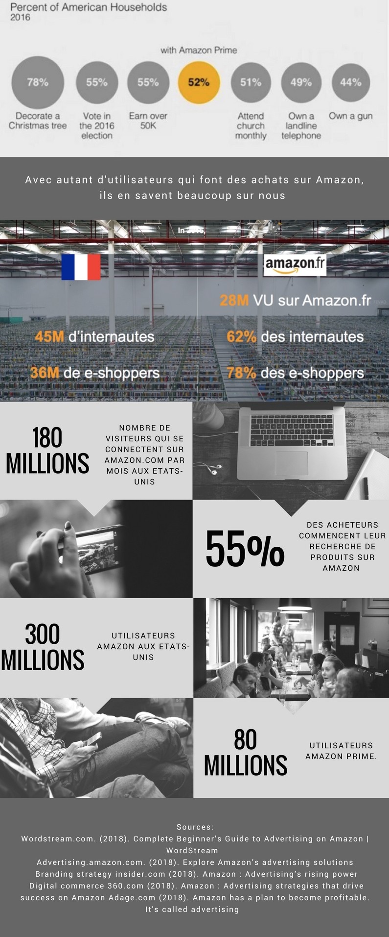 Amazon offre un placement sponsorisé dans son moteur de recherche depuis quelques années, mais il y a plus. Il veut se développer, en offrant aux marques des meilleures algorithmes pour s’assurer que leur produits vont s’afficher devant le client idéal. Alors qu’Amazon est une alternative au duopole publicitaire numérique de Google et Facebook, qui représentent ensemble 70% du chiffre d’affaires publicitaire en 2017, Amazon a un réel avantage: il possède une catégorie des internautes prêts à convertir.