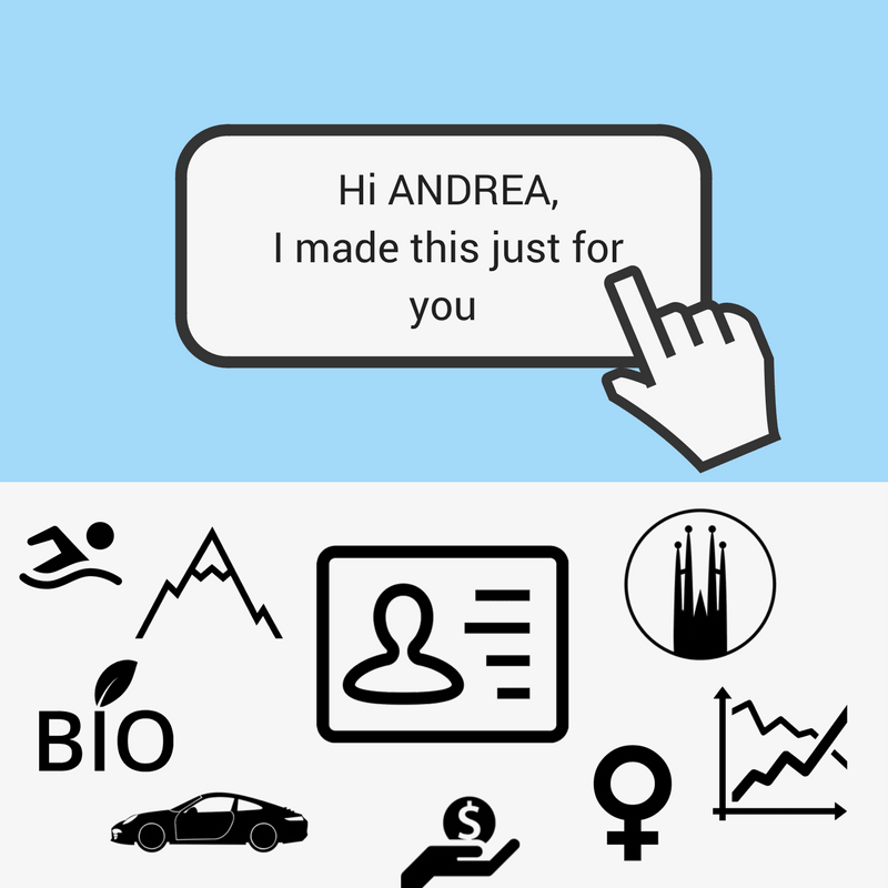 Andrea vient de Barcelona, elle a 28 ans et habite en France depuis 4 ans. Elle aime s’entourer d’objets et vêtements à la mode et adore amener ses amis dans les restaurants branchés de la ville. Quand elle se rend au supermarché, 70% des ses achats proviennent du rayon biologique. Dans son temps libre, elle va régulièrement à la piscine, elle profite des weekends pour aller à la montagne et elle s’intéresse aux actions des sociétés cotées en Bourse. Andrea adore aussi regarder les catalogues des voitures en ligne et elle rêve d’acheter un jour une voiture sportive !