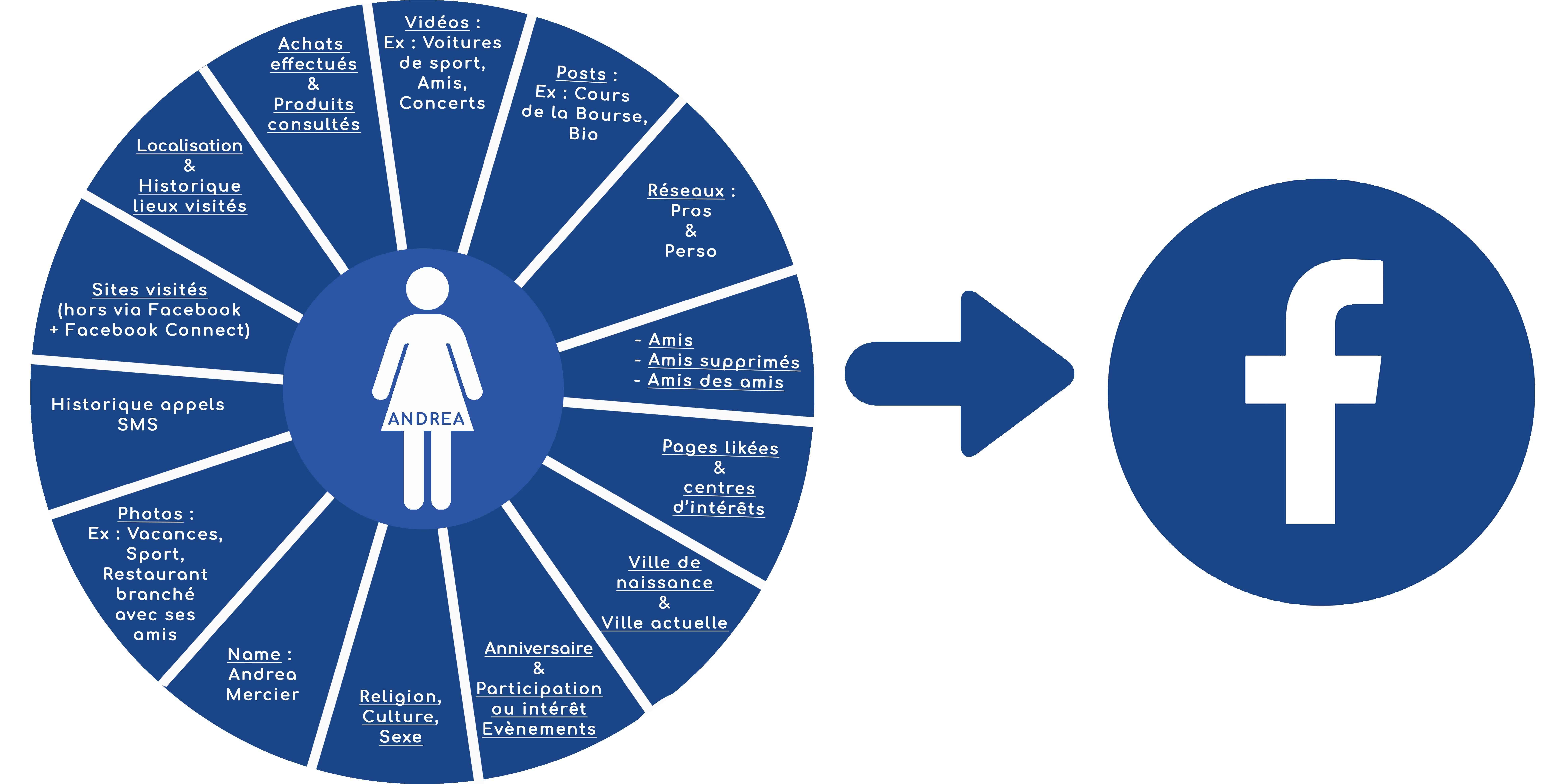 En se créant un compte Facebook, devenu quasiment indispensable dans la vie d’un jeune actif, aussi bien au niveau social, qu’au niveau professionnel, Andrea est devenue le profil Facebook « Andrea ». Cela va devenir alors déterminant dans sa « vie virtuelle » car son parcours web sera jonché de signes, d’appels et de rappels qui vont créer en elle de nouvelles envies, poussées par la créativité des marketeurs.