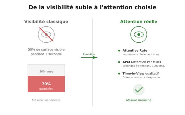 La visibilité constitue aujourd’hui la norme principale pour évaluer l’efficacité publicitaire.. Pourtant, cette norme technique est trompeuse. Aujourd’hui, une impression est considérée comme visible si 50% de sa surface s’affiche pendant une seconde. Ce critère est purement mécanique : il ne dit rien de l’intérêt réel de l’internaute. Une publicité peut défiler sur un écran sans jamais croiser un regard.