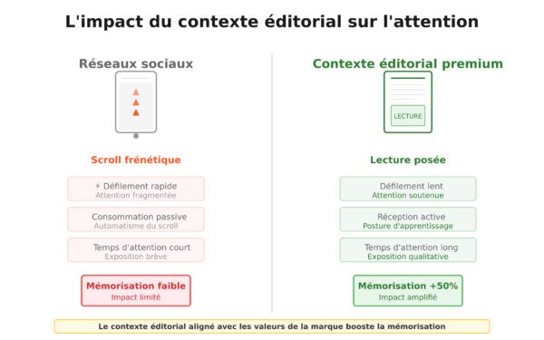 Le résultat est concret : la mémorisation peut être boostée de 50 % lorsque le contenu de la page est aligné avec les valeurs de la marque. On ne cherche plus seulement une audience, on cherche un moment de lecture propice.