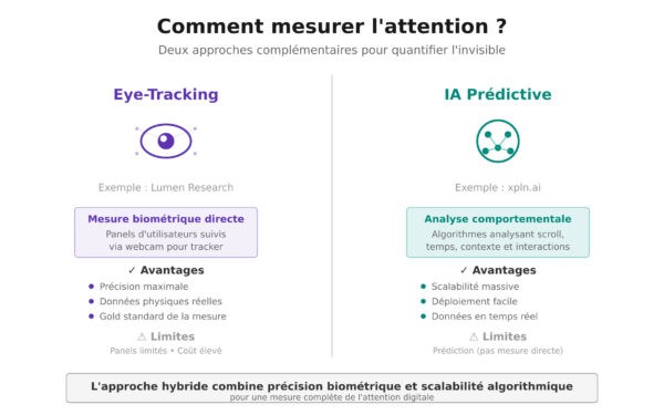 - L’IA prédictive (xpln.ai) : Cette approche utilise des algorithmes pour analyser des signaux comportementaux (vitesse de scroll, temps d’exposition, contexte). Plus facile à déployer à grande échelle, elle prédit le score d’attention sans nécessiter de caméra, en se basant sur les interactions réelles de l’internaute.